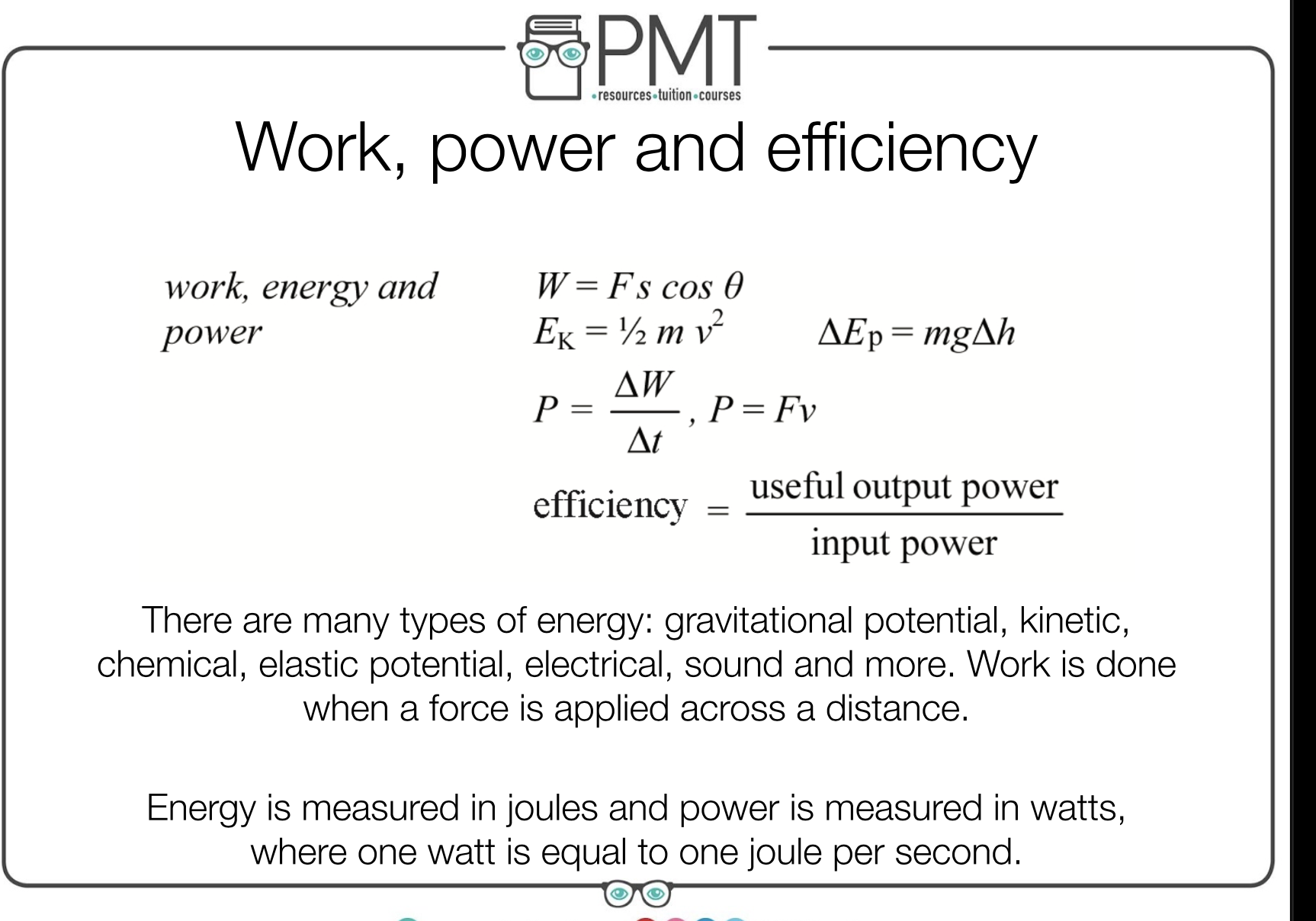 Work- is the energy transferred by a force (when a force moves through a distance).